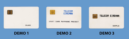 The first known test cards were produced by manufacturers Schlumberger and Gemplus. These were catalogued as Telecom Eireann Demo 1, Telecom Eireann Demo 2, and Telecom Eireann Demo 3 "Ireland's First Callcard" (pictured). These cards, particularly Demo 1 and 3 are extremely rare. Many test cards, particular the early ones were returned to the manufacturer after testing was conducted to be retested and then destroyed.